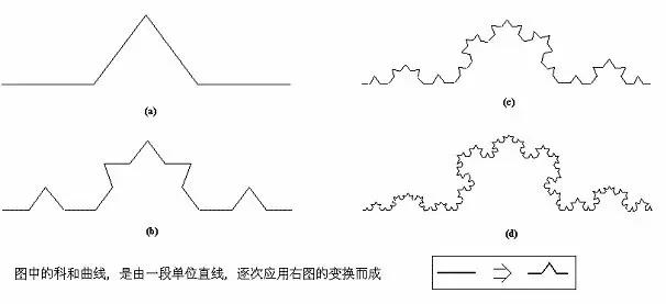 将每段线段等分成三段,中间一段替换为一个三角形的两条边,每一边都等于原线段的 1/3;