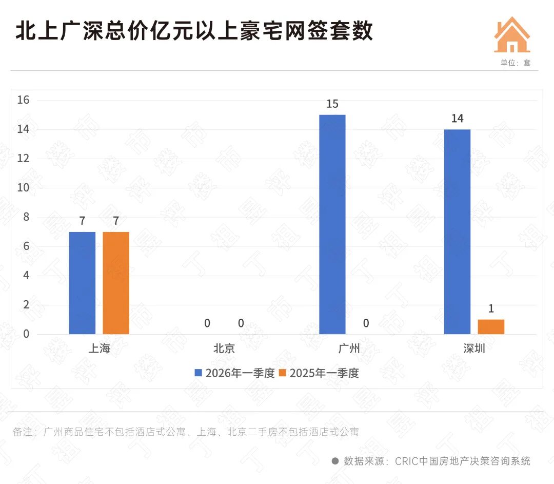 过亿豪宅成交,同比更是翻倍增长。2026年一季度,北京、上海、广州和深圳四城共成交了36套亿元以上豪宅,而去年同期这一数字是8套。(本文中上海新房过亿豪宅不包含风貌住宅)