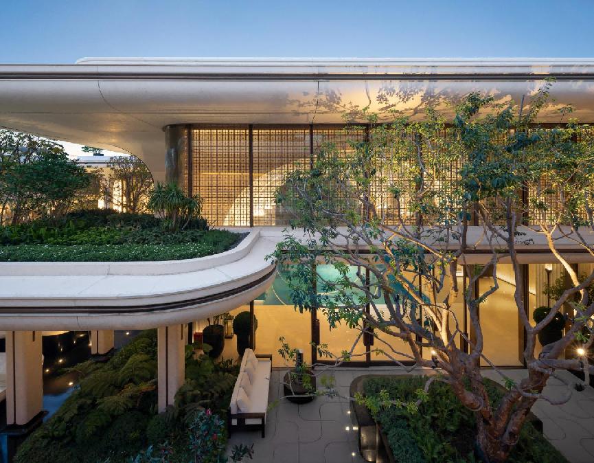 杭州绿城·月映金沙的地下会馆以约460㎡下沉水景庭院为核心,串联起天光篮球馆、恒温泳池、健身房等空间,泳池采用可开启电动幕墙,打开后与外部庭院绿植无缝衔接,营造出“在自然中运动”的独特体验。