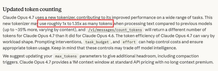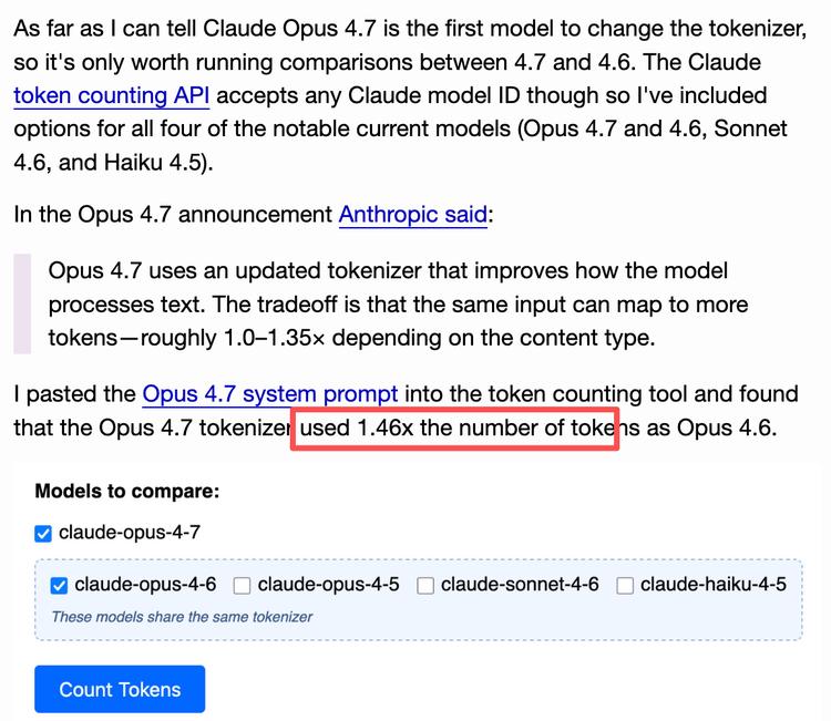 最先被注意到的,是同样的代码跑起来开始烧更多的钱。2026 年 4 月,Anthropic 发布 Claude Opus 4.7,官方公告里有一行小字:新模型采用了全新的分词器,“相同文本最多消耗 35% 更多的 Token”。Opus 4.7 和 4.6 的定价完全一致,输入 $5/百万 Token,输出 $25/百万 Token。