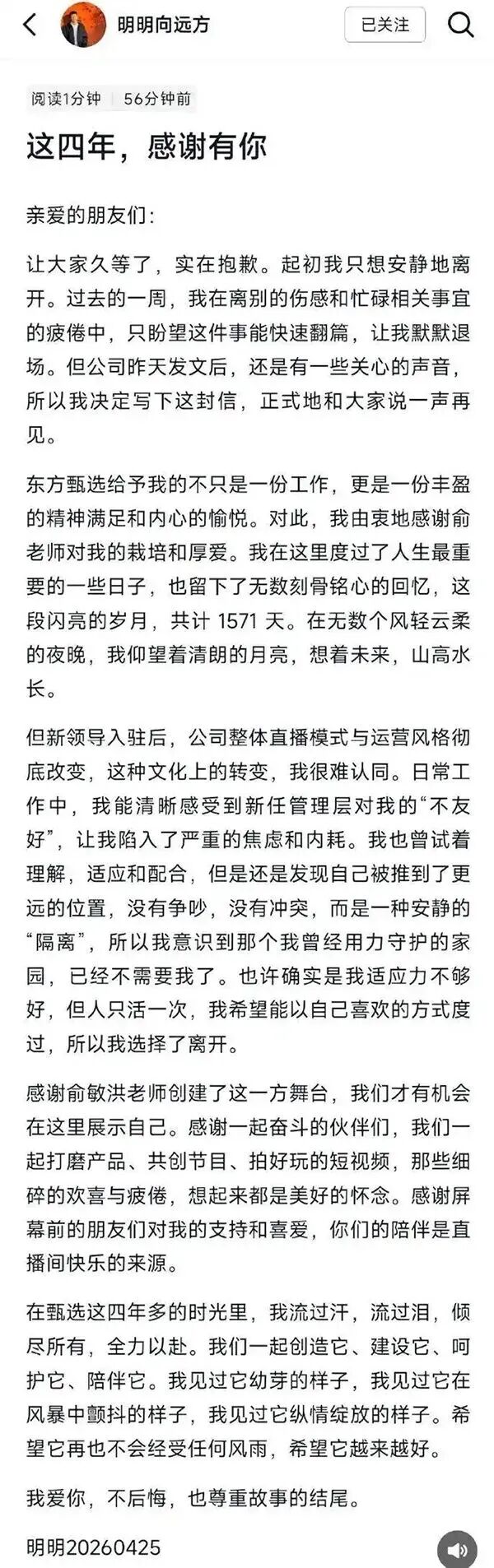 从董宇辉出走时的深夜长文,到东方小孙离开时的感慨万千,再到如今四位主播集体告别后的直播致歉,俞敏洪似乎总是在“亡羊”之后才来“补牢”。