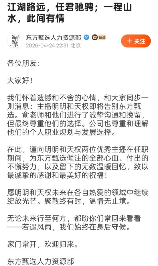 俞敏洪承诺,后续东方甄选将优化管理模式,在制度建设和人文温度之间寻找更好的平衡。