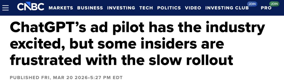 除了对手 Anthropic 在超级碗上的“精准嘲讽”,更残酷的反馈来自一线。CNBC报道,据多位广告业内人士透露,到目前为止,测试的进展过于缓慢,未能达到此前宣传的热度。测试计划令许多合作伙伴感到沮丧。