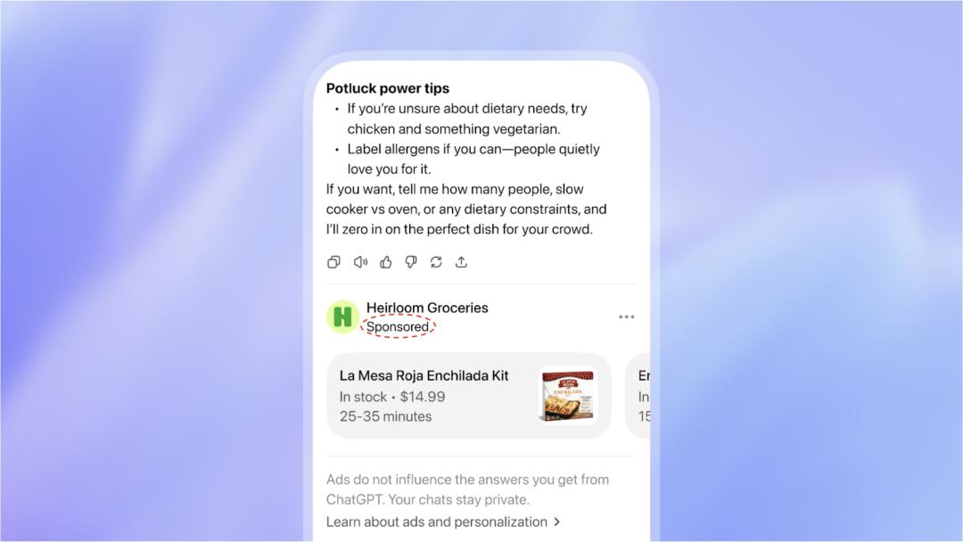 “广告运行在与我们的聊天模型不同的系统上,广告商没有能力塑造、排名或改变ChatGPT的回应。广告是分开的,并有清晰的标签。”OpenAI的官方问答中写道。