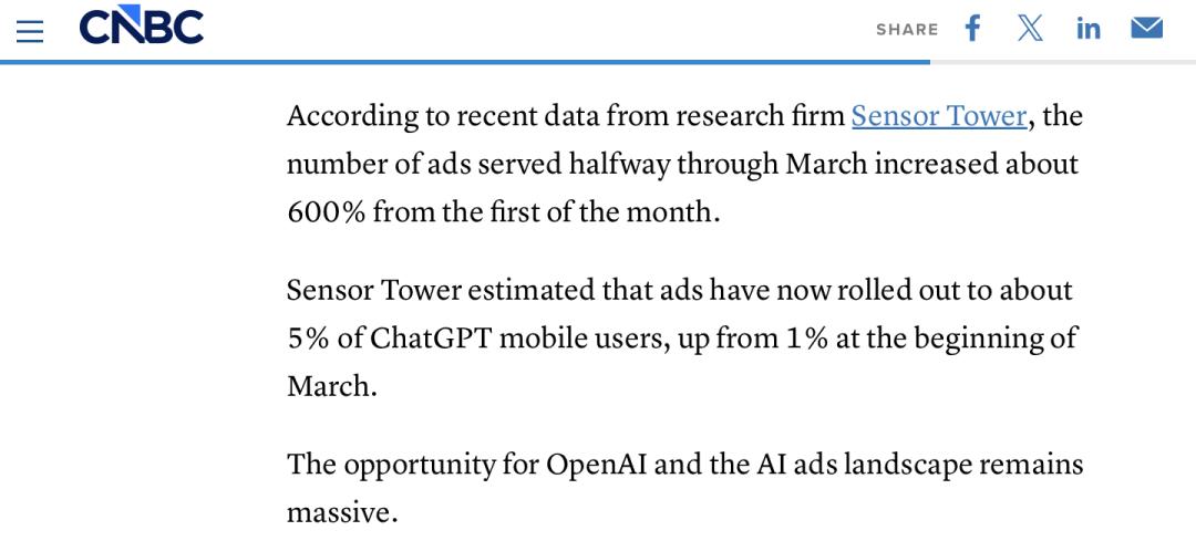 - 根据研究机构 Sensor Tower 的最新数据,截至3月中旬,ChatGPT上投放的广告量较月初增长了约 600%。估计目前的广告已覆盖约 5%的ChatGPT 移动端用户,高于3月初的 1%。