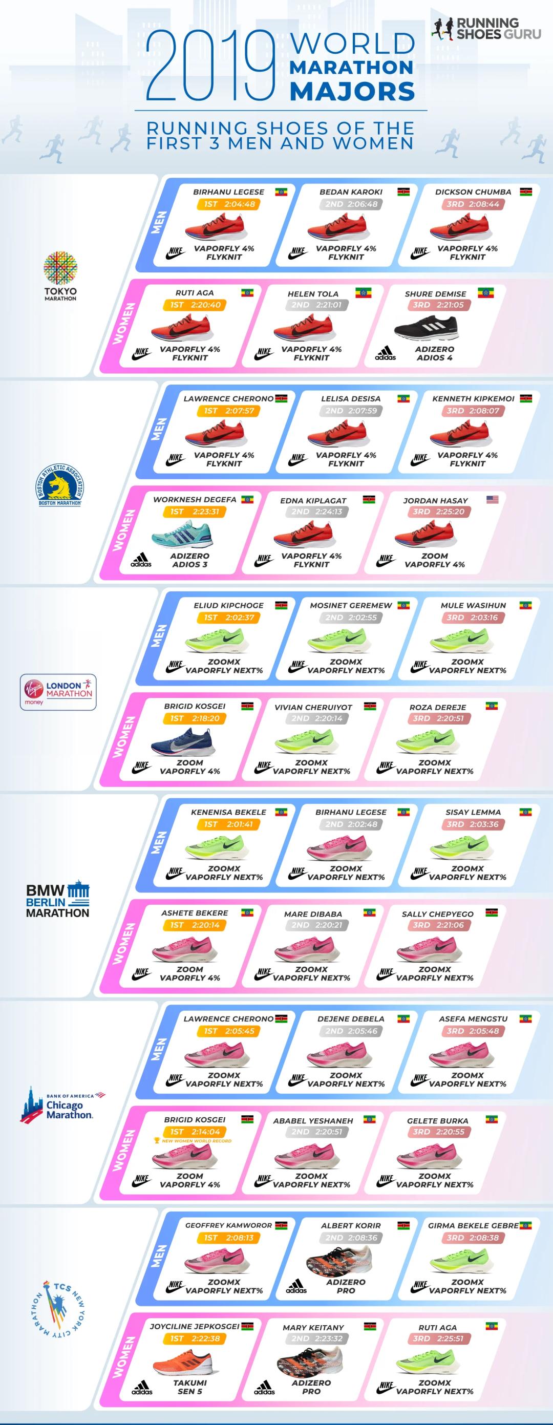 在跑步这条赛道上,最直接的观察窗口,莫过于马拉松大满贯赛事的领奖台。2017年前后,耐克凭借Vaporfly开启超级跑鞋时代,并迅速建立统治感,2018年,基普乔格在柏林刷新男子马拉松世界纪录,2019年,科斯盖在芝加哥刷新女子马拉松世界纪录,二人脚下都是耐克跑鞋。据runningshoesguru统计,同一年,马拉松大满贯36个男女领奖台席位中,有31个由穿Nike Vaporfly的选手拿下,耐克的logo几乎成为顶级路跑赛场最醒目的标识。