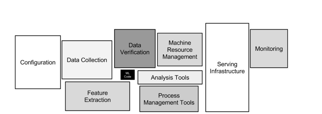 2015 年,谷歌发表了“机器学习系统中的隐性技术债务”。那篇论文为机器学习工程师指明了方向,并一针见血地指出了他们所面临的所有问题。文中分享的那张图片也成了经典:一个标有“ML Code”的小方框,被庞大的基础设施模块所包围。
