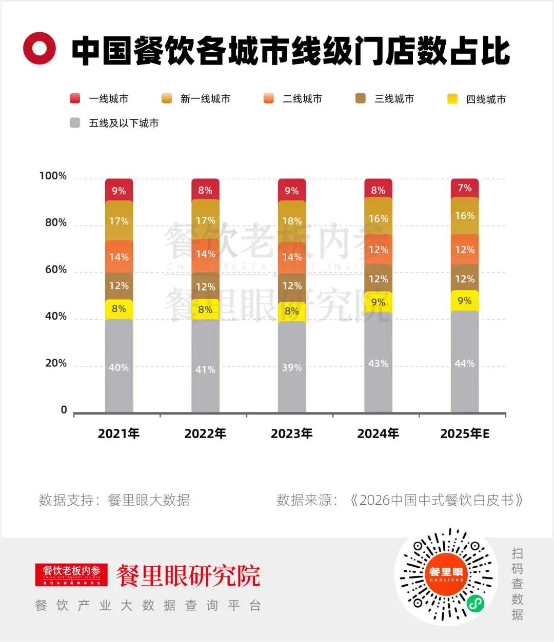 《2026中国中式餐饮白皮书》数据清晰印证这一趋势:近三年,一二线城市餐饮门店占比持续走低,而五线及以下城市门店占比从2023年的39%,2025年提升至约44%,成为拉动行业增长的强劲板块。