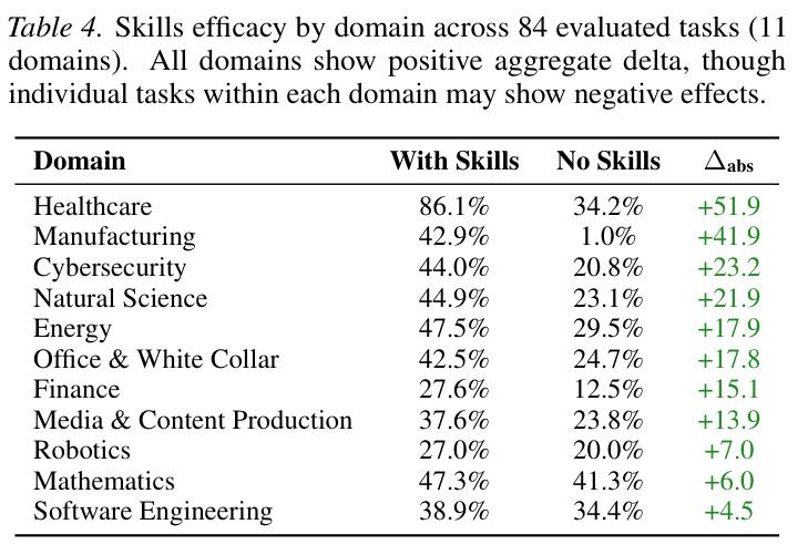 SkillsBench 按领域的 skill 效果(来源,SkillsBench 论文 Table 4)