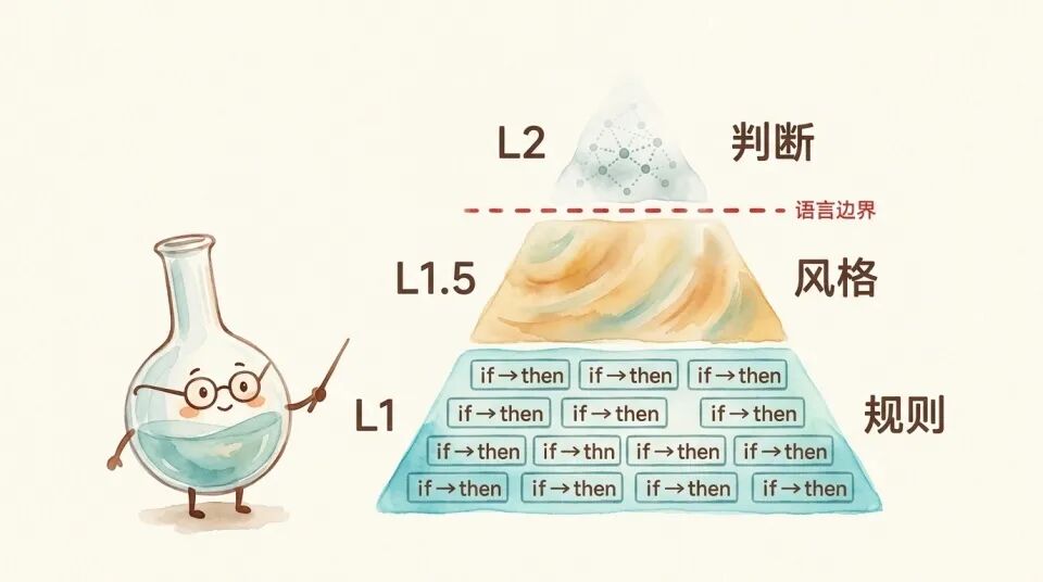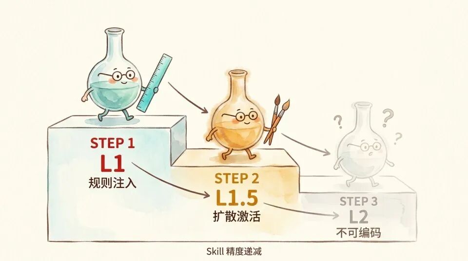 L1(生产性规则 + 陈述性知识路由)精确且无歧义。「如果 X 则 Y」,写出来就是那个意思,模型执行就是那个结果。这是 skill 最可靠的地带。