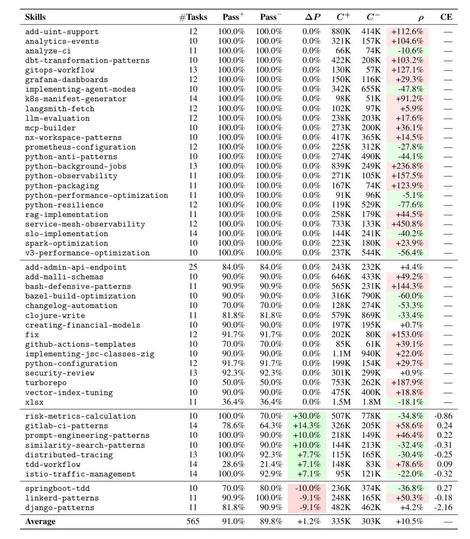 同期,Han, Zhang 等人专门在软件工程领域做了更细致的测试,并发表了论文《SWE-Skills-Bench: Do Agent Skills Actually Help in Real-World Software Engineering?》,测试了 49 个真实开源项目 Skill,约 565 个任务实例。