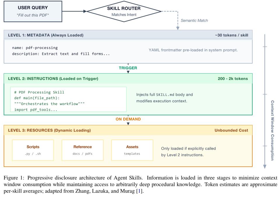 Skill 的三级渐进加载架构(来源,SoK 论文 Figure 1)