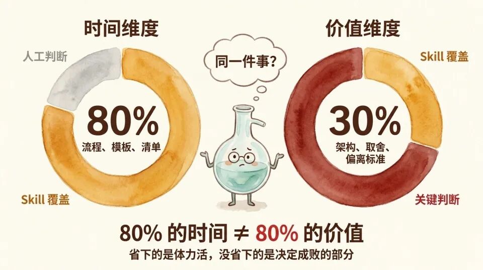 粗略估算只有 30% 到 40%。因为价值分布高度不均匀。那些不能被 Skill 覆盖的 20% 的时间里做的事,往往才是核心。