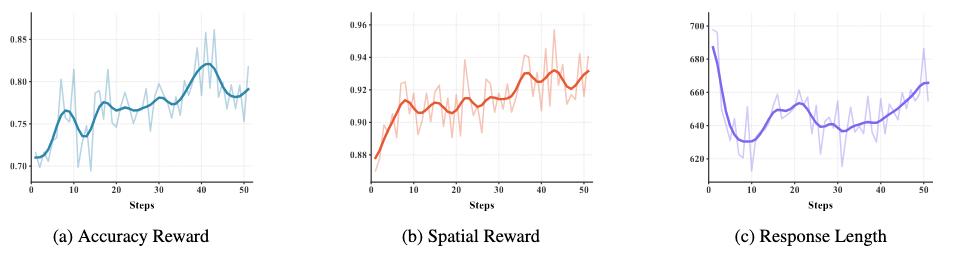 - 空间奖励(Spatial Reward)同步提升且趋势更稳定,表明模型逐渐学会在推理中显式利用图结构,而不是仅依赖时间模式。
