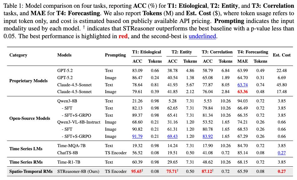 来自Emory University、Microsoft、Griffith University等机构的研究团队提出STReasoner——首个面向复杂时空时间序列推理(Spatio-Temporal Reasoning in Time Series)的Time Series LLM框架。实验表明,该模型在因果溯源、空间关系推理与时序预测等任务上实现了显著性能提升,并在真实数据上展现出强泛化能力,同时计算成本仅为闭源模型的0.004×。