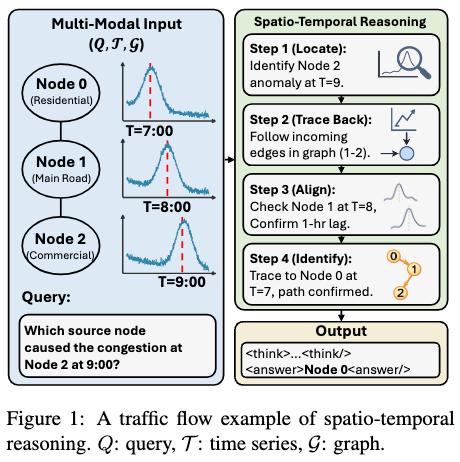 这类问题不能通过单点预测解决,而需要跨时间与空间进行多步推理:模型首先定位目标节点的异常时刻(时间维度),随后沿图结构回溯潜在影响路径(空间维度),并对齐不同节点之间的传播延迟(时空耦合),最终识别真实的因果源。该过程本质上要求同时整合时间动态、空间依赖与语义查询,进行跨节点、跨时间步的结构化推理。