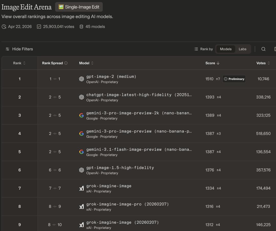 Arena.AI单图编辑榜(Image Edit Arena):GPT Image 2 (medium) 仍以1510+分继续登顶,第二、三、四、五名全部被OpenAI自家模型和Google Gemini系列占据。https://arena.ai/leaderboard/image-edit