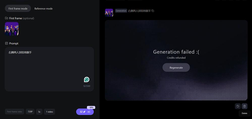 不过,可能是因为画面中涉及多位真实人物,模型拒绝了这一生成请求。