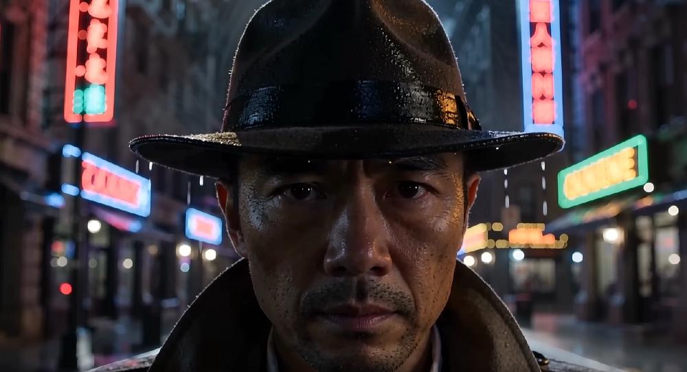 夜晚城市街道,一名侦探在雨中行走,霓虹灯反射在湿漉漉的地面上,镜头从远景缓慢拉近到特写,电影黑色风格。