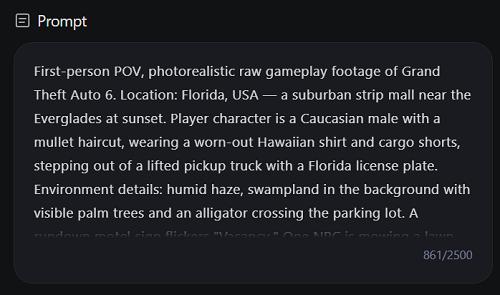 在这一案例中,我们考察了HappyHorse 1.0对复杂提示词的理解能力。这段提示词长达800词,描述的是一个类似知名游戏《GTA》的实机演示画面。