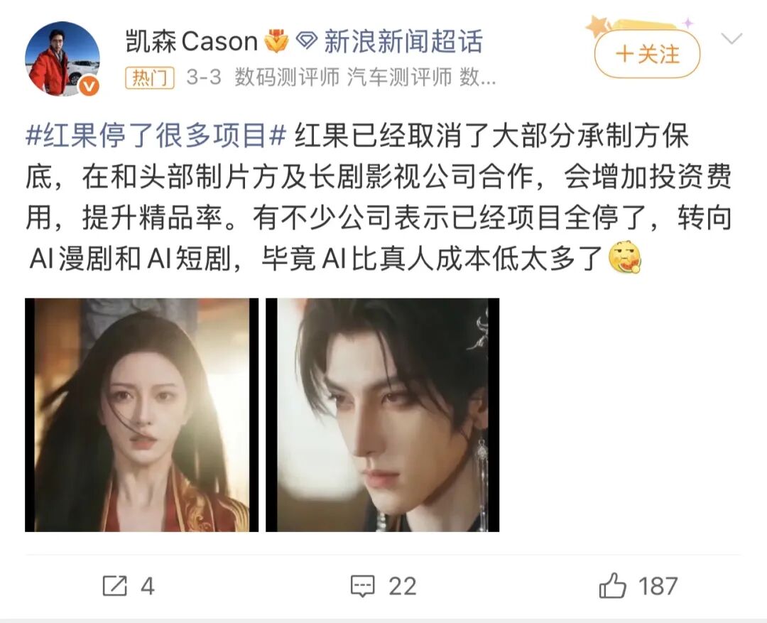 这场寒潮落在个体命运上面,便是霸总专业户张小磊,受AI短剧冲击选择回村种辣椒;横店演员里艺称现在一些短剧女主的日薪已降低到150元;小红书上,各种IP的短剧演员在评论区留下一句句“别来,没组开工”;曾经供不应求的短剧化妆师等幕后职业,现在被AI抽卡师取代……从月入三万到回乡种地,从戏约多到排不过来到无戏可拍,这些短剧从业者们在短短数月中的起伏跌宕,某种程度上也与短剧的高密度高反转形成了互文。