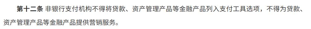 新规第十二条原文写着:“非银行支付机构不得将贷款、资产管理产品等金融产品列入支付工具选项,不得为贷款、资管产品提供营销服务。”