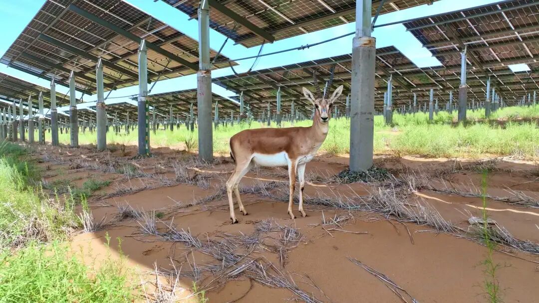 站在基地观景台上,你能理解这个词的字面意思:640多万块光伏板,从脚下沿着沙丘铺开,一直延伸到地平线;板下扎着草方格、种着梭梭和柠条、板间养着鸡和羊。基地建设前,这里植被覆盖度不足0.5%,三年后这个数字升到28%。流动沙丘转化为半固定沙地,多年未见的鹅喉羚、赤狐、麻雀、喜鹊都回来了。