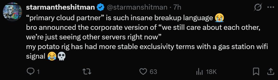 此外,还有网友发出惋惜,认为“主要云合作伙伴”听起来像极了分手话术,“我们仍互相关心,但是要和其他服务器约会了。”