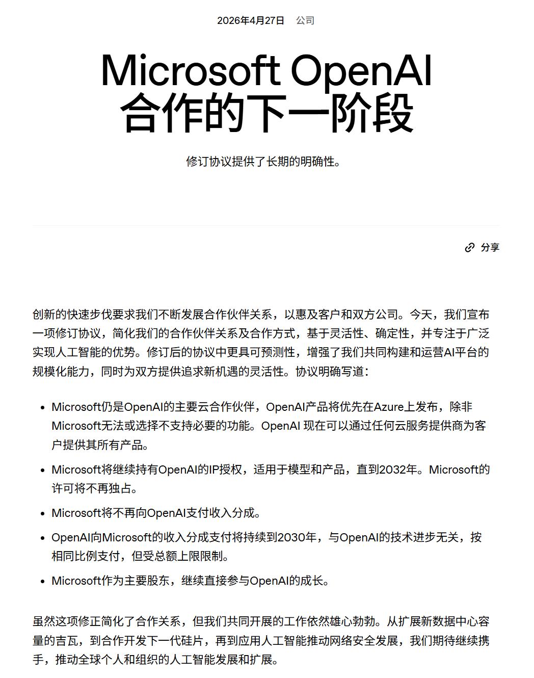 微软将不再向OpenAI支付收入分成,OpenAI对微软的收入分成持续到2030年,并设总额上限。