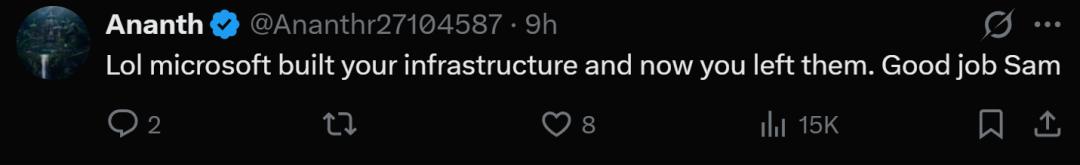 也有网友吐槽奥尔特曼过河拆桥,“微软给你建了基础设施,现在你说走就走,干得漂亮萨姆。”