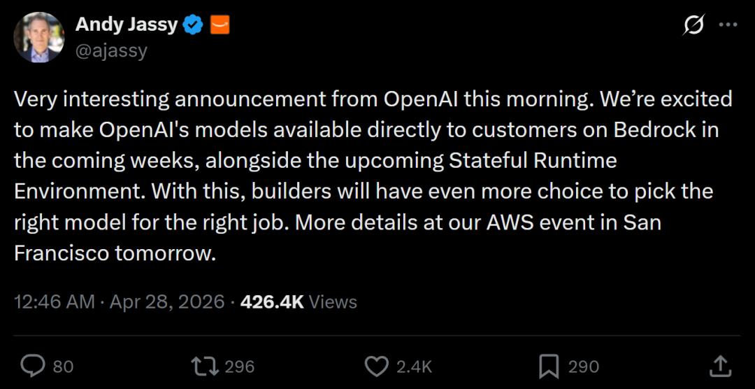亚马逊CEO安迪·贾西(Andy Jassy)发文称,AWS将在未来几周内通过Bedrock服务向客户提供OpenAI模型,并将次日的旧金山活动上公布更多细节。他说:“这样一来,开发者将拥有更多选择,为合适的任务挑选合适的模型。”