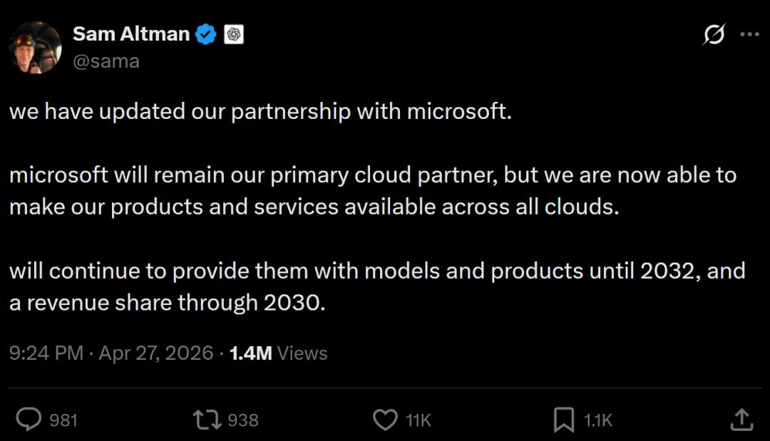 智东西4月28日消息,今天凌晨,微软与OpenAI联合宣布,修订延续多年的合作协议,结束了微软在OpenAI模型对外分销上的独家地位,OpenAI从此可向所有云服务商客户提供其全部产品。