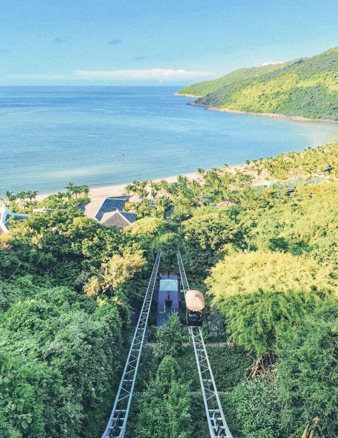 如果你想要更彻底放空,不妨去巴拿山住一晚。巴拿山海拔约1500米,法殖民时期就是法国人的避暑胜地。山上的缆车系统被列入吉尼斯世界纪录,是世界上最长的单线缆车之一,全程约5公里,从山脚到山顶需要近20分钟。缆车缓缓攀升,车窗外的景色从热带丛林变成云雾缭绕的山巅,气温从30℃骤降到20℃出头,仿佛在短短二十分钟里穿越了两个季节。山顶的佛手金桥是必到之处——长150米的空中步道由两只巨大的佛手托起,站在桥上俯瞰山谷,云雾在你脚下翻涌,像是行走在云端。