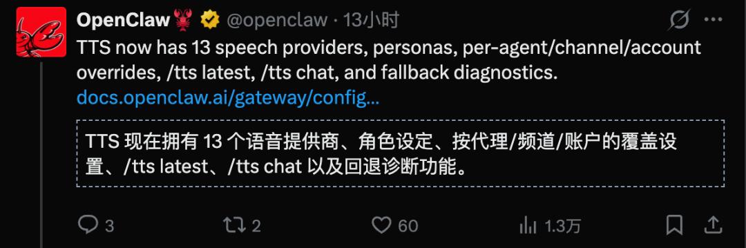 新版本一口气接入13个语音提供商,支持personas级别的个性化覆盖——每个智能体、每个频道、甚至每个账号都可以独立配置不同的语音方案。