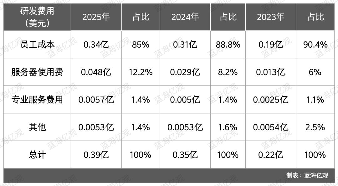 XTransfer的研发成本,也大部分花在给研发人员发工资、奖金方面,这一开支在2025年占总研发费的85%,而其服务器、专业服务费等合计占比仅为15%左右。