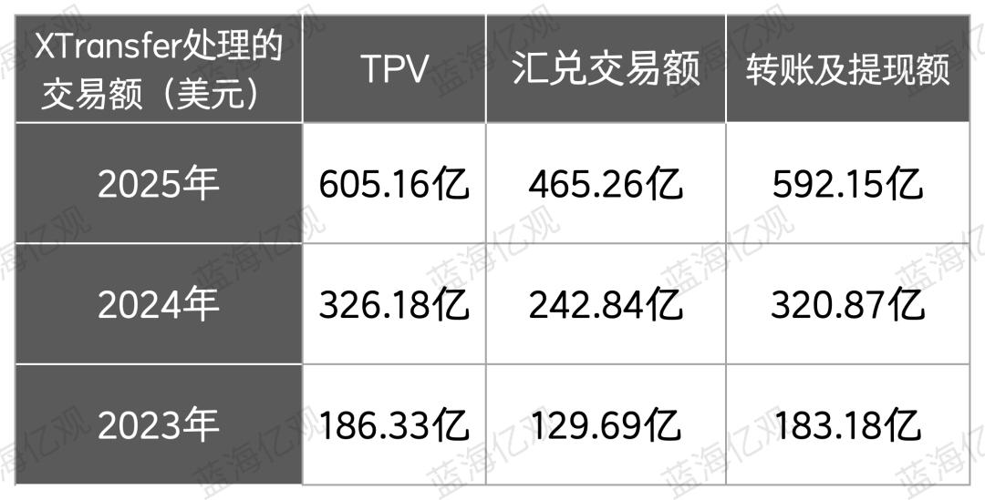在极低的费率和地毯式的营销动作的推动下,XTransfer的TPV(总支付价值或总交易额)持续增长,从2023年的186.33亿美元,增长到2025年的605.16亿美元,复合年增长率为80.2%。