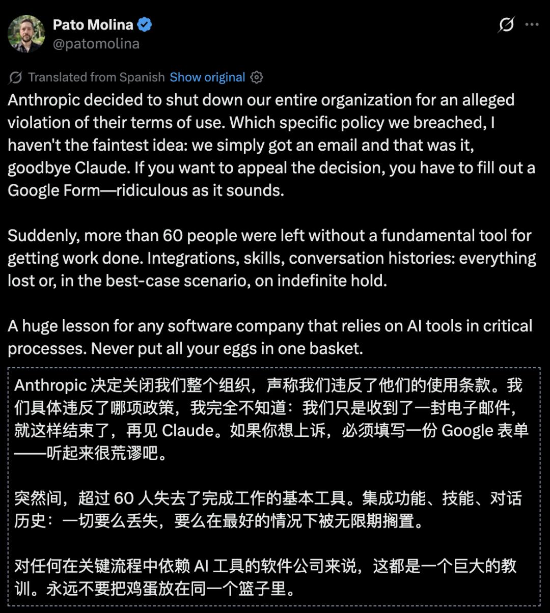就在不久前,拉美金融科技公司Belo的CTO Pato Molina在X上发帖:公司60多个Claude账号一夜之间被集体封禁,同样零预警,同样只有一封冰冷的模板邮件,同样申诉无门。