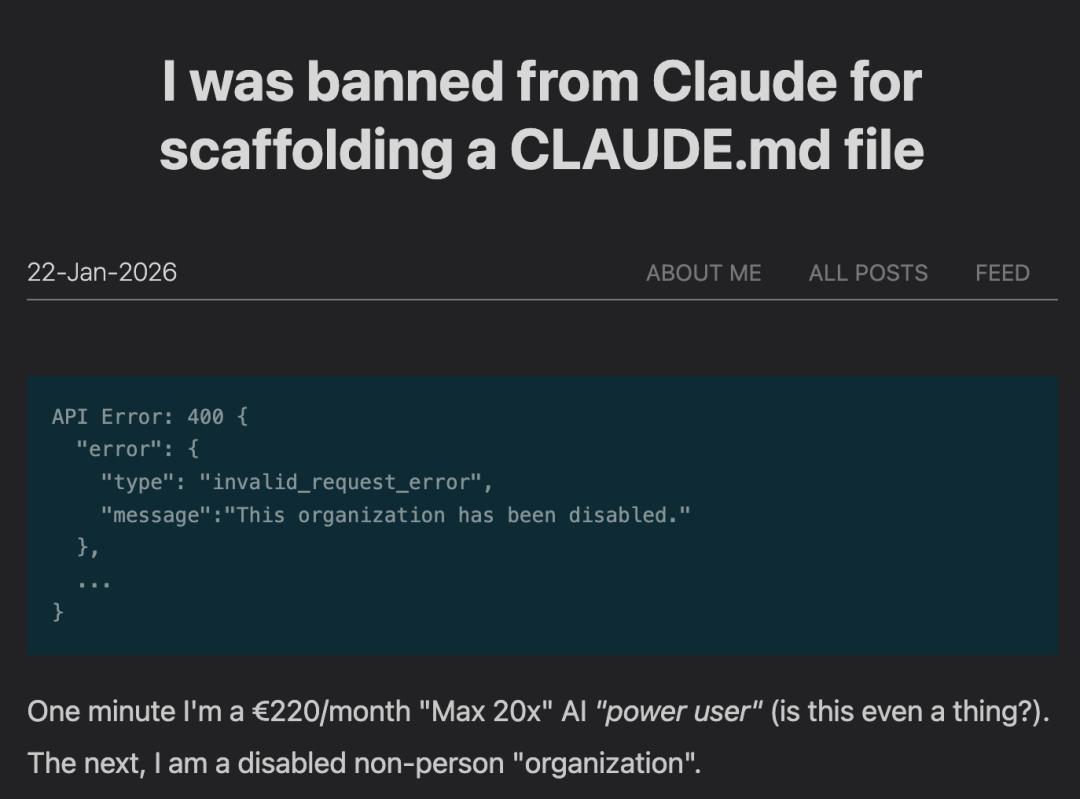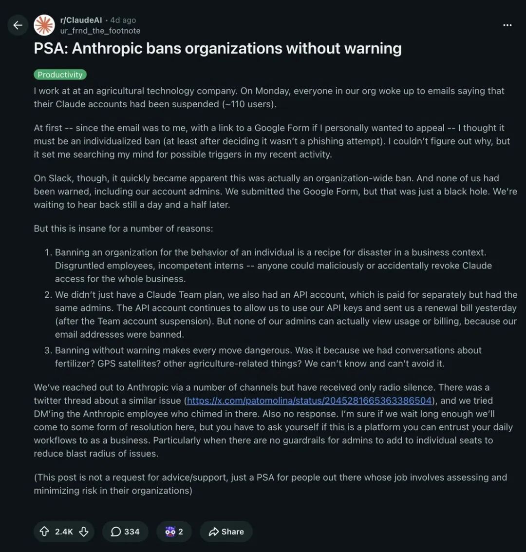 「Anthropic封了我们整个公司的账号,110个人,零预警。」