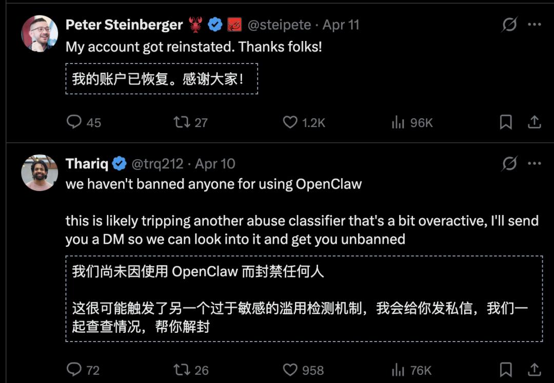 Anthropic工程师Thariq否认与OpenClaw有关,第二天Peter Steinberger账号就恢复了——同样没有任何正式解释。