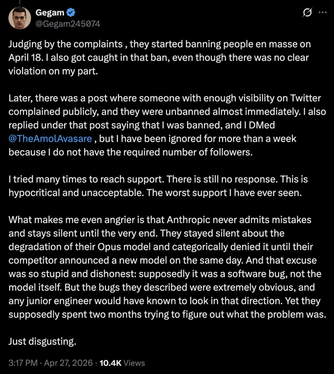 根据投诉情况来看,Anthropic从4月18日开始大规模封禁用户。