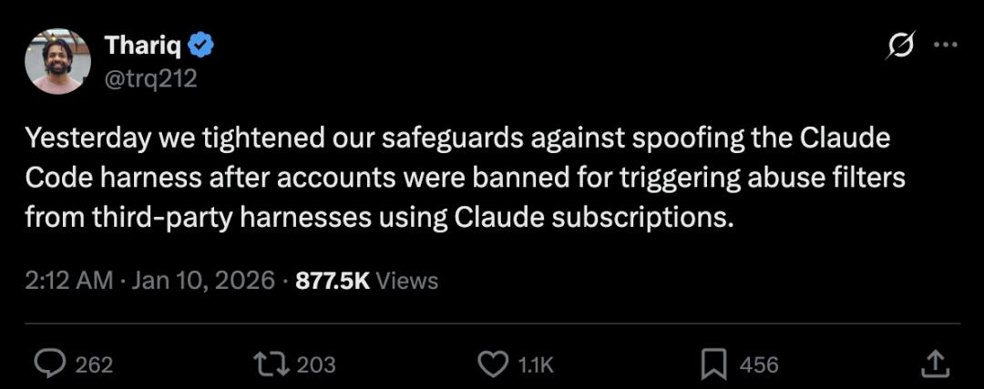 今年1月,Anthropic收紧第三方工具接入安全措施,官方技术人员公开承认造成了「意外的附带损害」。