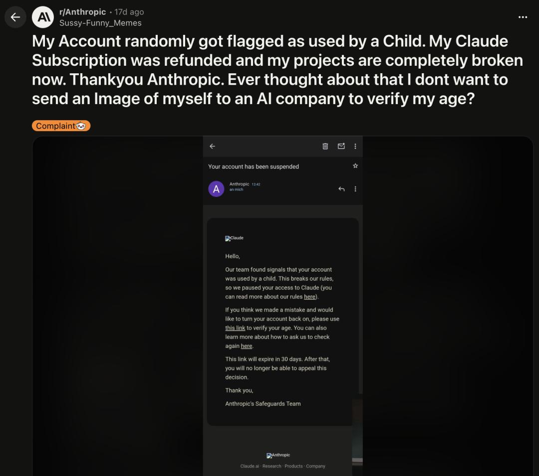 甚至有多名用户报告,自己的付费账号被错误标记为「未成年人」而遭到封禁。一个成年人,付着Pro的钱,被AI系统判定为小孩然后踢出门外。