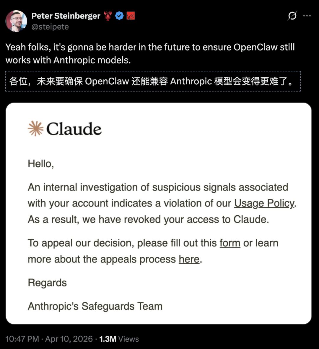 更早之前,OpenClaw创建者Peter Steinberger的Claude账号被封,预测OpenClaw要兼容Anthropic模型悬了!