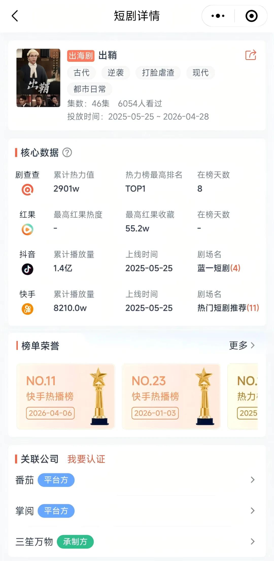 DataEye剧查查数据显示,《出鞘》于2025年5月上线,累计热力值2901万,抖音端原生播放量1.4亿,快手端原生播放量8210.0万,曾连续多日登上DataEye短剧热力榜,最高位列热力榜榜首。