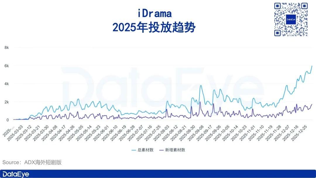 ADX海外短剧版数据显示,截至目前,iDrama累计投放430天,累计投放素材量20.3万组(智能去重),2025年11月底、12月初开始iDrama投放力度大幅提升,日投放素材量由2000组左右攀升至约6000组。