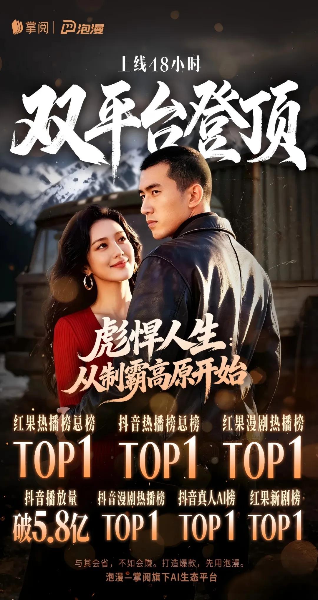 此外,其出品的AI真人剧《彪悍人生:从制霸高原开始》自2026年4月18日上线以来,48小时实现红果、抖音双平台登顶,登上红果热播榜、抖音热播榜、红果漫剧热播榜、抖音漫剧热播榜、抖音真人AI榜等多榜单第一名,抖音播放量破5.8亿。