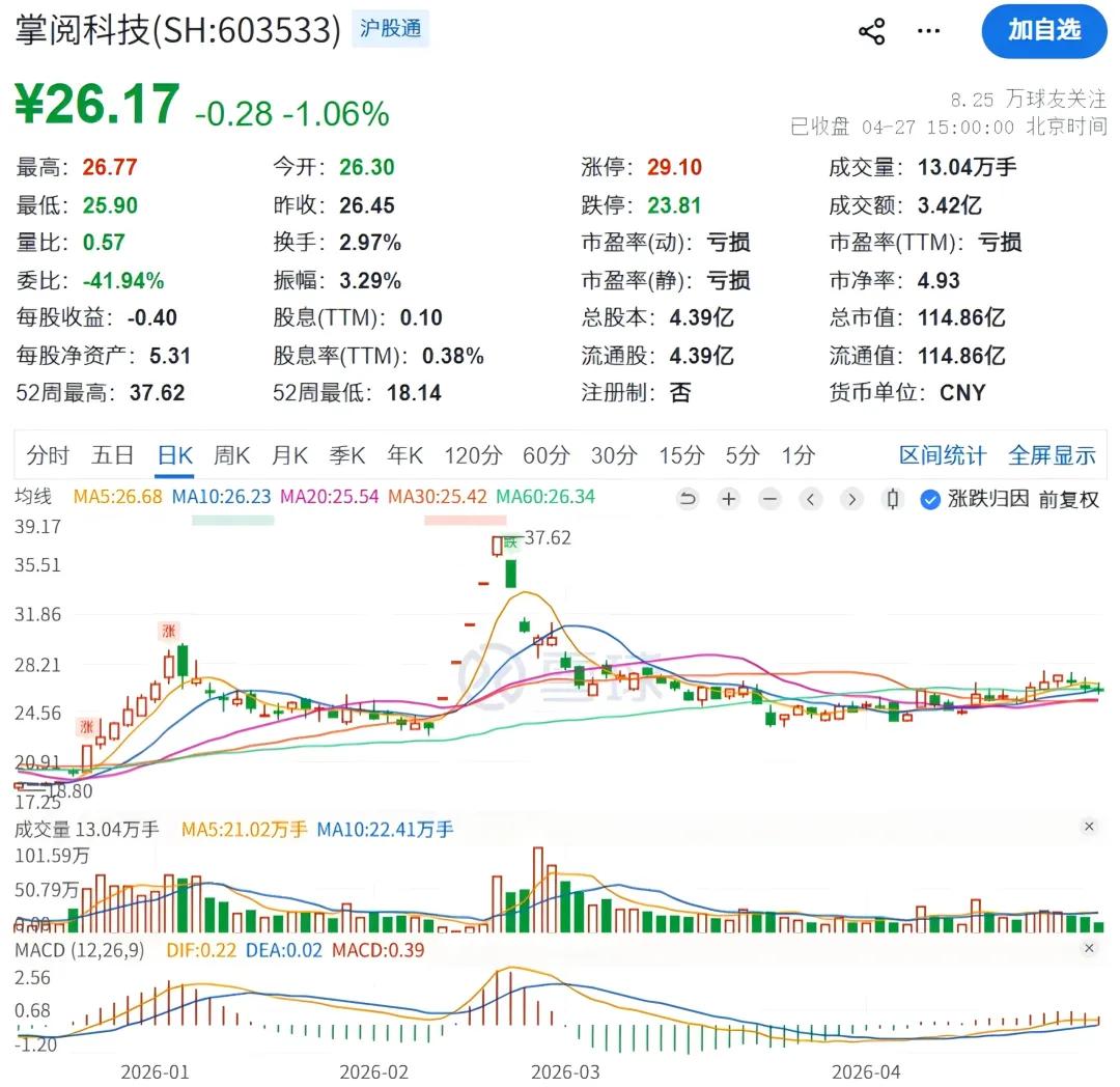 资本层面,截至4月27日收盘,掌阅科技股价26.17元/股,股价较今年最高点的37.62元/股下跌了30.4%,市值114.86亿元。
