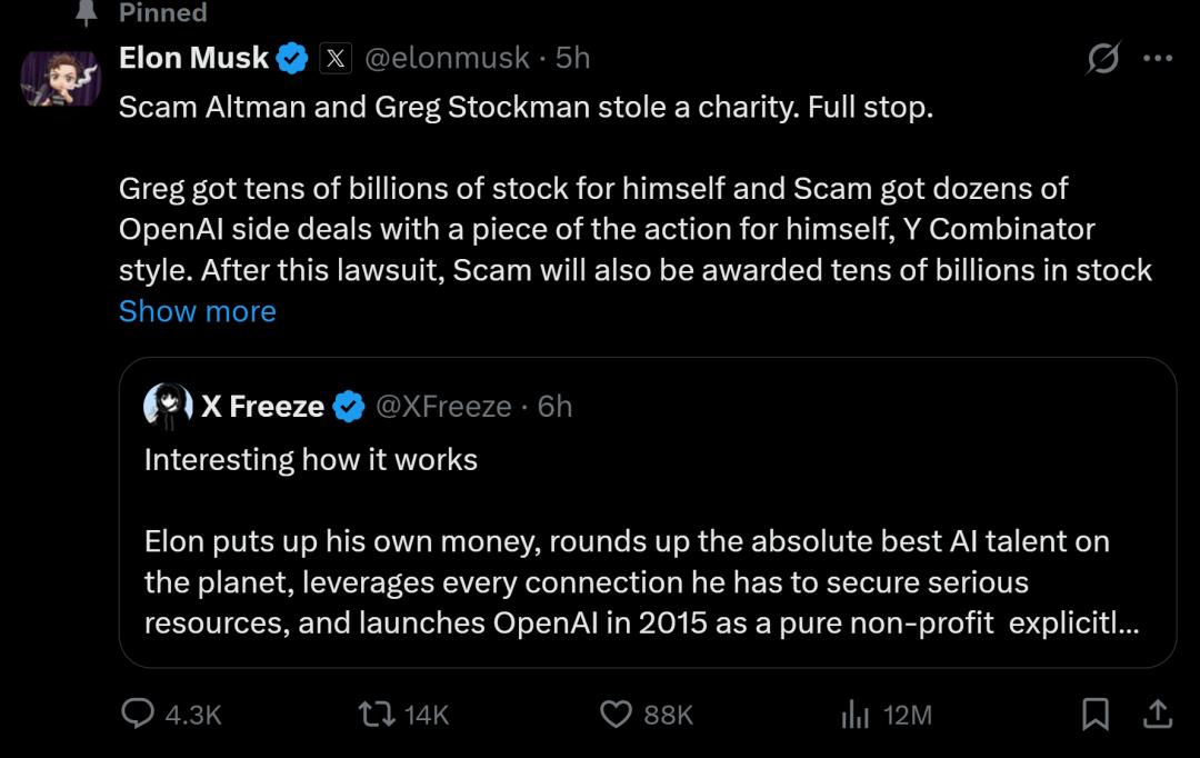 ▲马斯克发帖怼奥尔特曼和布罗克曼(图源:X)
