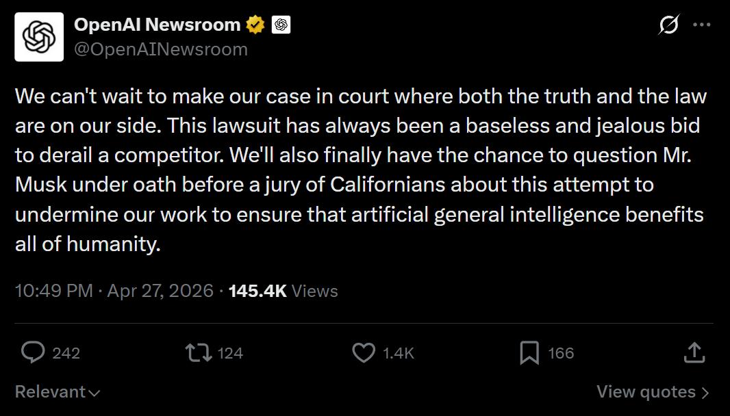 庭外,双方的口水战继续升级。开庭前,OpenAI官方新闻账号OpenAI Newsroom在X上发文称:“我们迫不及待要在法庭上证明自己,真相和法律都站在我们这边。这场诉讼一直是一场无理且嫉妒的、企图阻挠竞争对手的举动。”