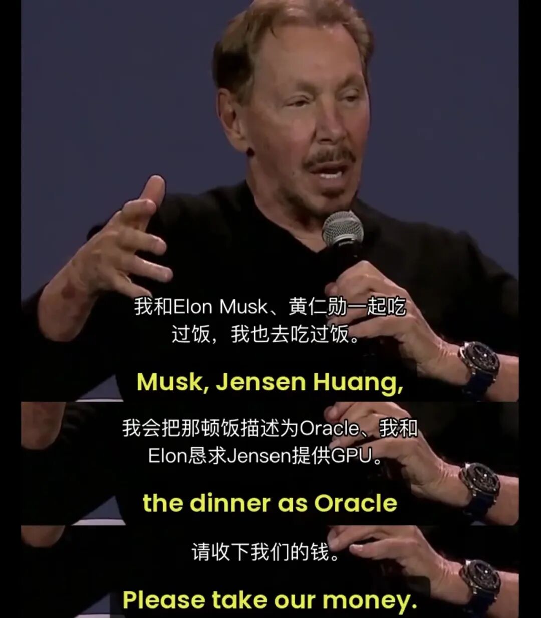 甲骨文的老板埃里森曾说他和马斯克一起去约黄仁勋吃漂亮饭,全程两人几乎就只是在翻来覆去的说一句话: